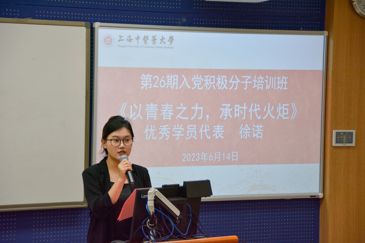 中医学院本科生徐诺以“以青春之力,承时代火炬”为题发表了学习感言,她表示,培训班的结业只是一个起点,仍需经历长期的自我磨炼和自我提升,主动向党组织靠拢,坚定不移听党话、跟党走,在日常工作学习中彰显中医青年的蓬勃力量,传承创新发展好中医药事业,争取早日成为一名合格的中国共产党员。