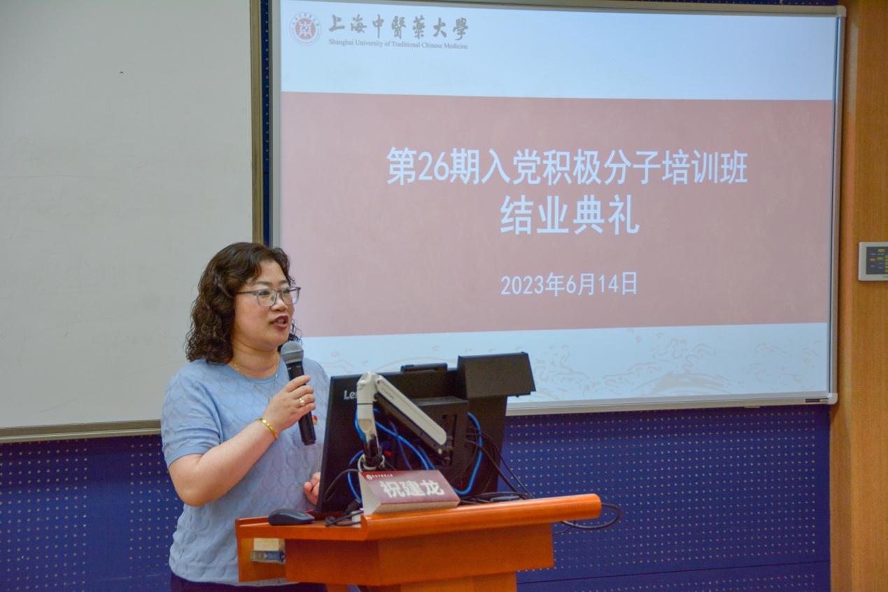 祝建龙在总结讲话中对培训班全体学员顺利结业表示祝贺,并与学员们谈心交流。她鼓励广大青年坚定理想信念,补足精神之钙,自觉以传承创新发展中医药为使命,充分发挥中医药作为中华文明宝库钥匙的独特作用,为健康中国建设注入青春力量;勇于实学实干,锤炼过硬本领,坚持实事求是,脚踏实地,争做先锋,鼓励全体学员,勇立潮头,奋发有为,做“眼有星辰大海,胸怀赤胆忠心”的新时代好青年。(交叉科学研究院分党校)