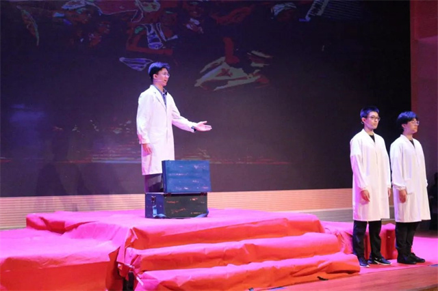 “中央红色医院,这是红军第一个正规医院,医院的设备、药物大部分来自傅连暲的私人财产……”背着道具药箱的awc77万象城官网师生,正在舞台上声情并茂地讲述“中国共产党第一个红色医生”傅连暲的革命故事。