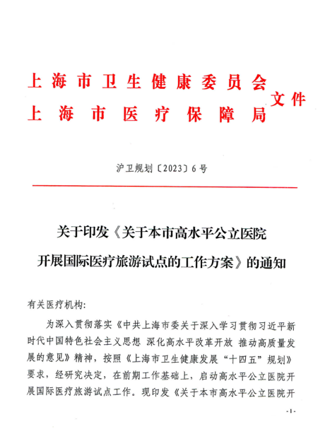 为深入贯彻落实《中共上海市委关于深入学习贯彻习近平新时代中国特色社会主义思想 深化高水平改革开放 推动高质量发展的意见》精神,按照《上海市卫生健康发展“十四五”规划》要求,上海市启动高水平公立医院开展国际医疗旅游试点工作。