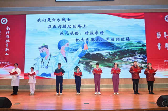 全国教书育人楷模、学校科技人文研究院院长刘红宁教授现场深情寄语广大教师:大力弘扬教育家精神,奋当为党育人、为国育才的大先生。第五届“上海市教育功臣”获得者、曙光医院院长房敏教授带领新进教师代表,完成庄严而神圣的教师宣誓仪式。
