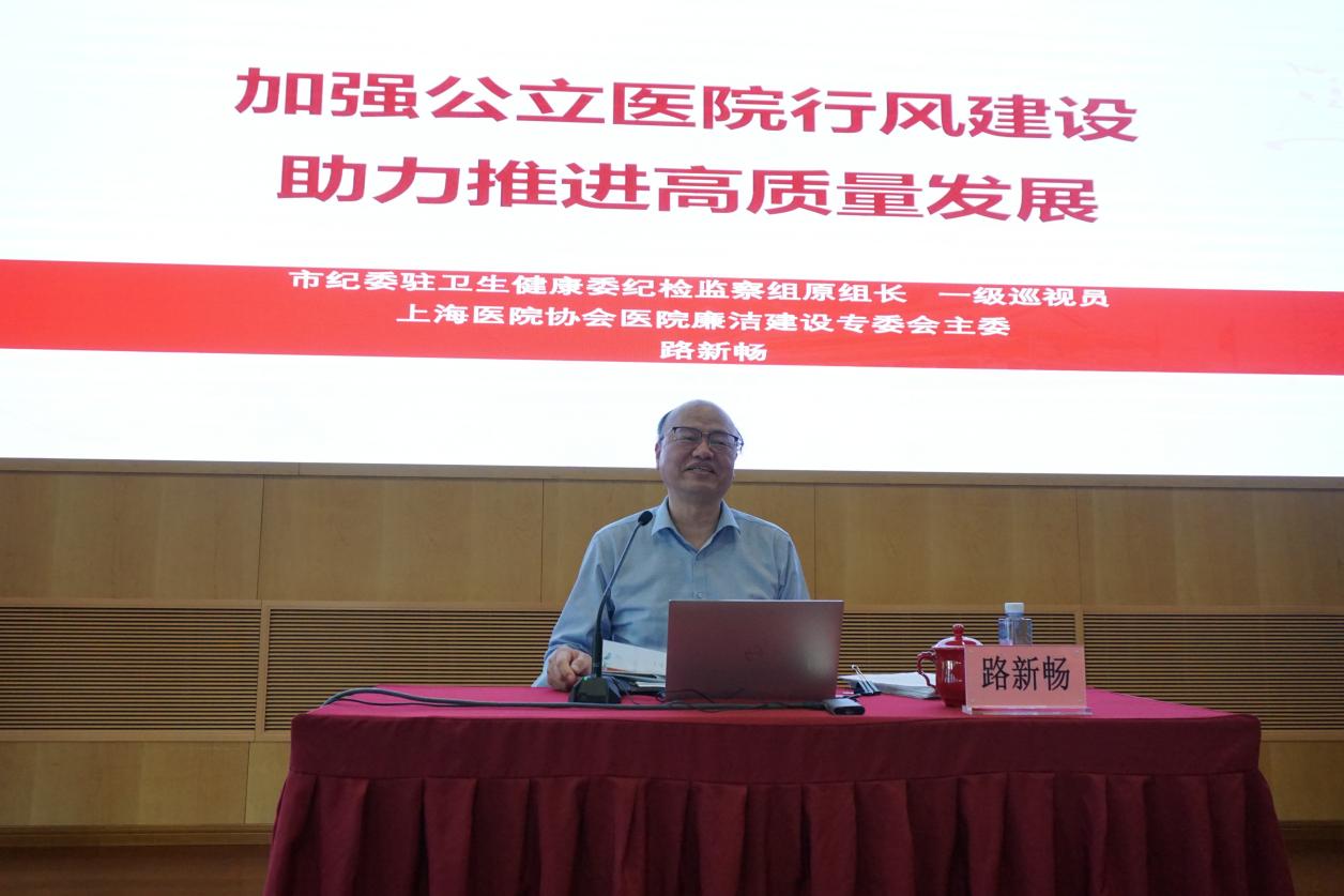 市纪委驻卫生健康委纪检监察组原组长、一级巡视员、上海医院协会医院廉洁建设专委会主委路新畅作“加强卫生系统行风建设 助力推进高质量发展”专题报告。他从医疗卫生系统行风建设形势、需要厘清的政策和法律的边界及公立医院廉政建设的工作建议三个方面,结合易发廉洁风险点及相关案例,深入剖析卫生行业廉洁风险防控现状。他强调以案为戒、以案明纪,受警醒、知敬畏、存戒惧、守底线,要切实做到锤炼政治品格、践行党的初心、坚守廉洁底线、自觉接受监督,把全面从严治党责任落到实处。