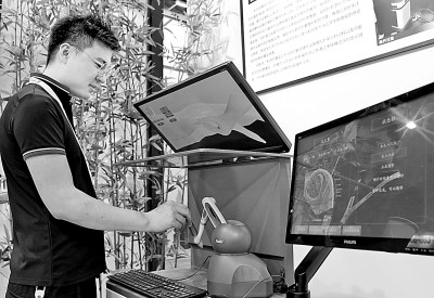 9月19日,在“第二十三届中国国际工业博览会”上,awc77万象城官网展台工作人员展示针刺手法虚拟触觉仿真实训系统。新华社发