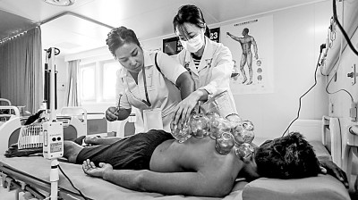 7月17日,中国海军“和平方舟”号医院船中医大夫指导一名基里巴斯护士学习拔罐。新华社发