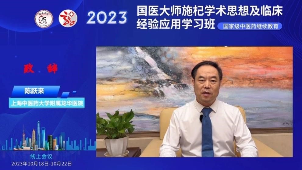 开幕式上,附属龙华医院陈跃来院长向线上参加学习班的领导、专家和同道表示热烈欢迎,希望大家在学习传承国医大师施杞教授高深的学术理论和丰富的临床经验的同时,更要学习他对病人满腔热情、对技术精益求精的精神,学习他不忘初心、敢于创新、艰苦奋斗、锲而不舍,为中医药事业坚持创新性发展的新时代中医人的风范。