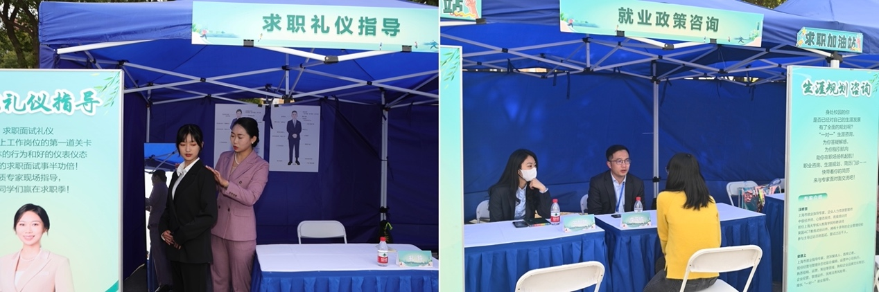为加强毕业生求职“实战”指导,学校在招聘会现场设立“求职加油站”,由5位就业指导专家“一对一”为学生提供就业政策咨询、生涯规划咨询、简历指导和求职礼仪指导。中药学专业的本科毕业生葛怡彤表示:“我目前投出去了20多份简历,参加招聘会之前我就接受了简历门诊和面试指导,今天礼仪老师讲解的面试着装、接待礼仪等内容也让我印象深刻,感到十分受用,对后续面试、进入职场更有信心。”