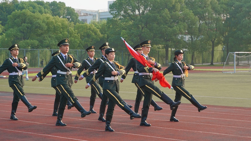 由退役大学生士兵组成的国旗护卫队步履铿锵,护送鲜艳的五星红旗入场。