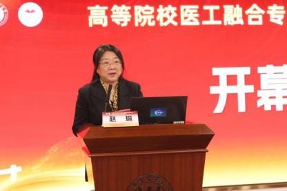 赵琛致欢迎辞,她表示要进一步推动中医医工融合专业的教学合作,深入交流探讨,共同推进中医药医工融合专业教学联盟建设步伐。