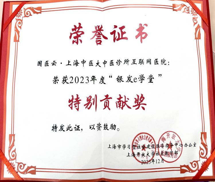 12月8日,国医云·上海中医大中医诊所互联网医院受邀出席在上海开放大学举办的2023年度“银发e学堂”成果展示活动并获特殊贡献奖。