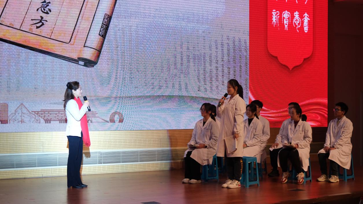 大会善用“大思政课”,释放中医药文化育人动能。随着悠扬的上课铃声响起,“杏林春华”导师团初心学堂开讲。团长刘平,导师何兰萍、赵心华,辅导员王飞携中医学(屠呦呦班)学生现场上一堂弘扬青蒿素精神的人生大课。从古籍经典讲述中医药文化的传承创新,从科技创新重大成就讲述科学家精神,从屠呦呦发现青蒿素讲述中医人的责任使命,实现思政课程、课程思政、日常思政的有机融合,推动学生思政教育课堂的延伸、格局的拓展和平台的提升。生动的情景剧把屠呦呦的人生经历、动人事迹和时代场景,打造成这场“大思政课”的生动教材。刘平团长现场为学生讲解科学家精神的内涵,激励学生立大志,成为传承创新中医药的医学科学家。