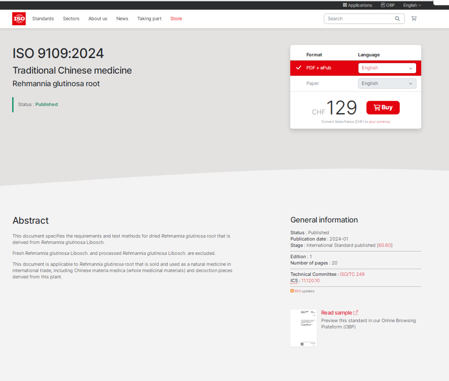 《中医药—地黄》标准提案于2021年2月向国际标准化组织/中医药技术委员会(ISO/TC 249)递交,当年11月通过投票正式立项,共有来自中国、加拿大、德国、匈牙利、意大利、日本、韩国和荷兰8个国家的提名专家与项目团队共同制定标准。合作团队针对地黄标准制定在相关国家的具体情况,经过数轮答辩与讨论修改,对标准进行研究修订,今年正式出版。