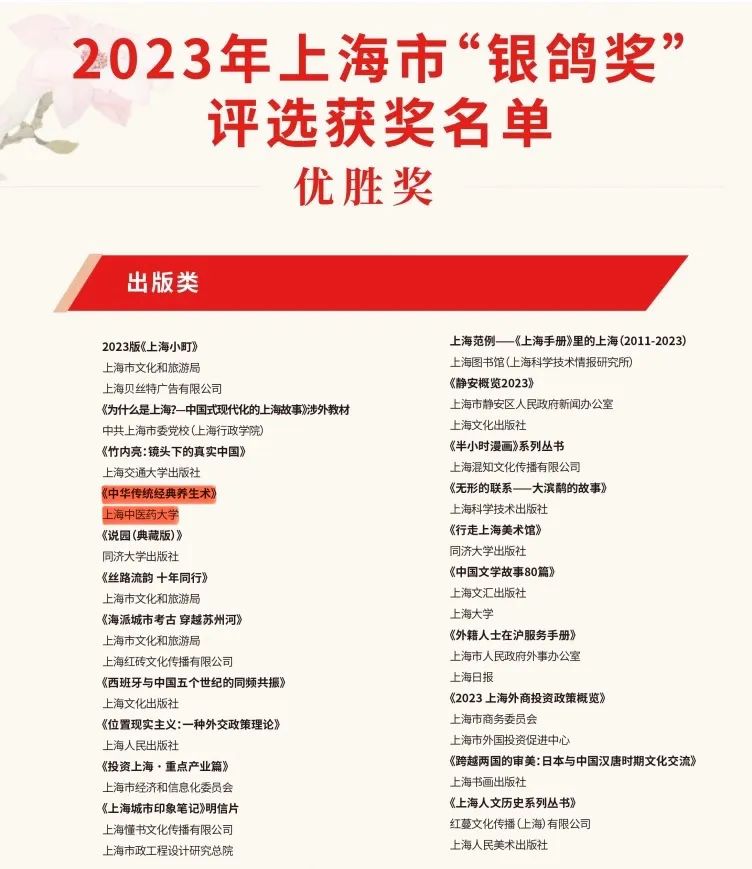 近日,2023年上海市“中华文化走出去”专项扶持资金项目和“银鸽奖”评选结果揭晓。经专家评审,万象城官网申报的《“太极健康”主题中医药文化海外推广》入选2023年上海市“中华文化走出去”专项扶持资金项目,《中华传统经典养生术(希腊语版)》从650余件作品与项目中脱颖而出获2023年上海市“银鸽奖”(出版类优胜奖)。
