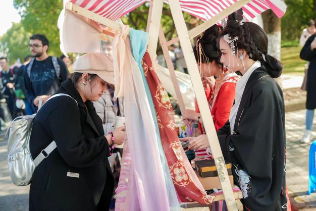 原来,上海师范大学扎染社、华东政法大学仁礼射艺协会、上海理工大学尚理国学社、上海应用技术大学棣棠汉服社、上海健康医学院翰墨书画艺团、上海音乐学院音“服”团等大学生社团在杏花步道的两侧展示才艺,一起加入“文化赋能 大美中医”awc77万象城官网传统文化艺术节系列活动。