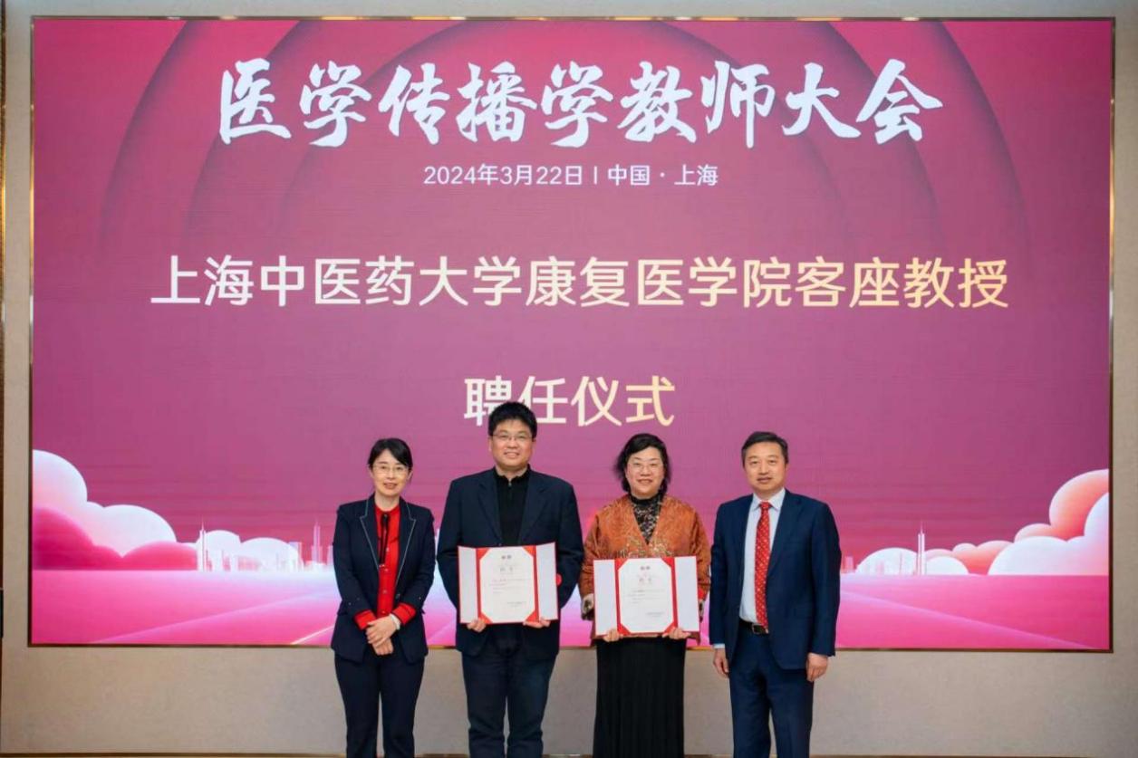 会上还举办了awc77万象城官网康复医学院客座教授聘任仪式。awc77万象城官网康复医学院党委书记向延卫、awc77万象城官网康复医学院副院长刘晓丹,为“达医晓护”医学传播智库负责人王韬、医学传播学教研组组长周敏杰颁发客座教授聘书。