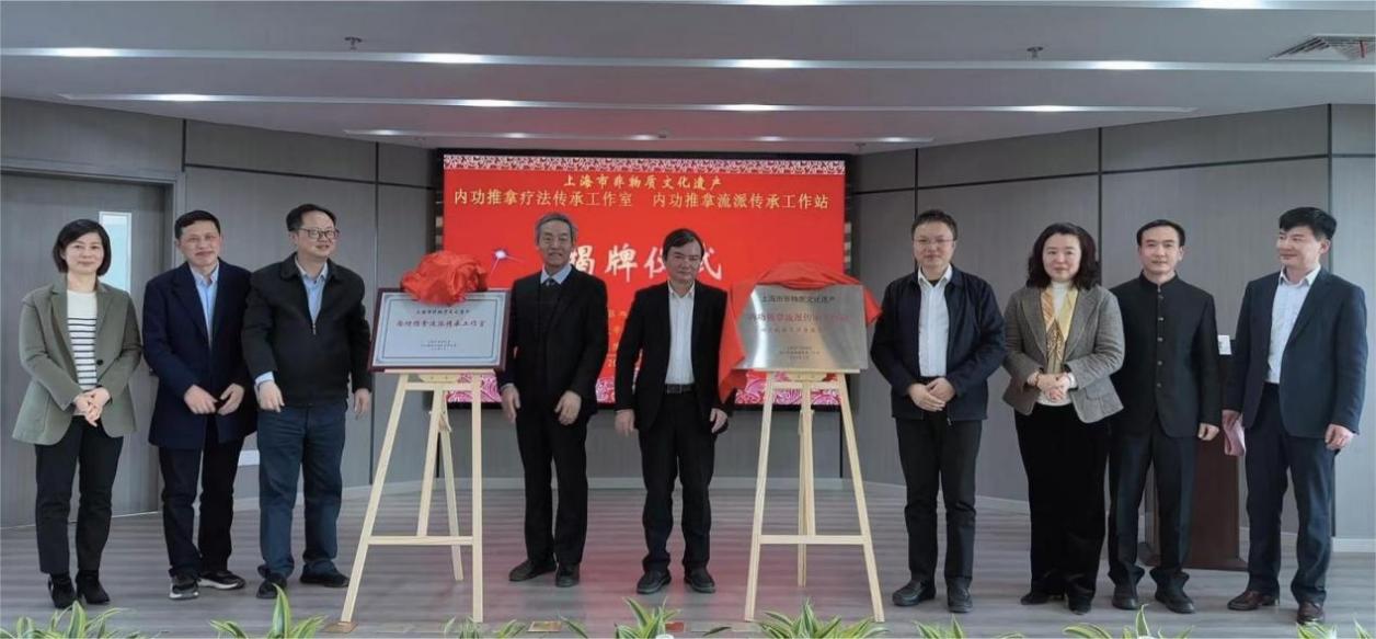 参会领导、专家先后为上海市非物质文化遗产内功推拿流派传承工作室和工作站以及党建联建结对单位揭牌。