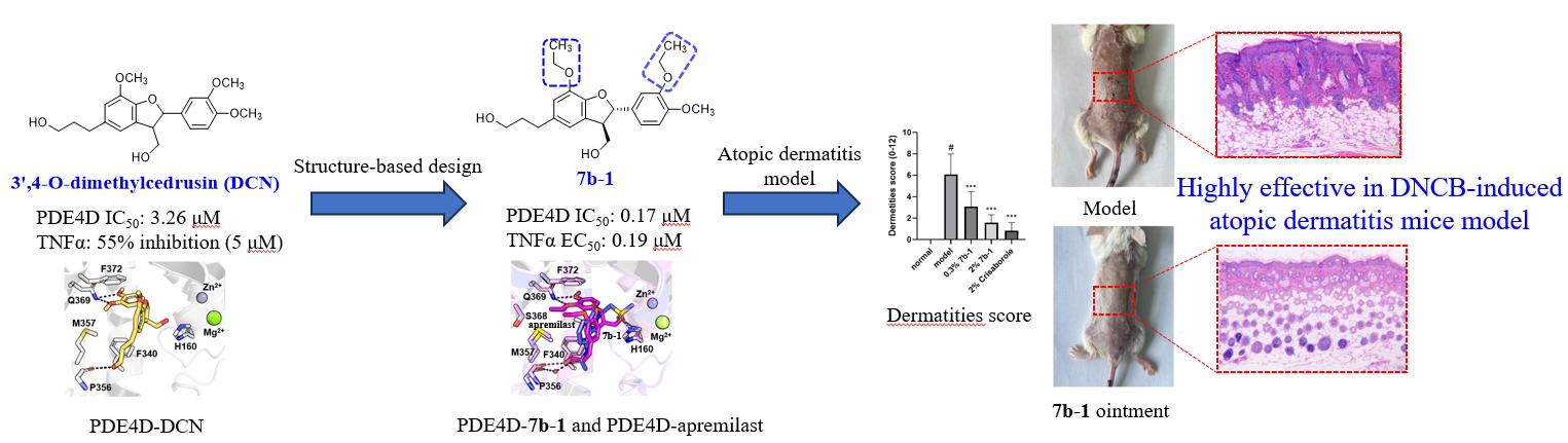 中药治疗特应性皮炎有上千年的历史,临床疗效确切,可作为抗特应性皮炎药物开发的重要源泉。李医明课题组对中药辛夷的化学成分进行了系统的研究,在前期发表的系列文章证明其所含木脂素成分的抗过敏作用后,通过高通量筛选,发现了一种新型骨架的PDE4抑制剂—二氢苯并呋喃型木脂素(3',4-O-dimethylcedrusin,DCN),令人新奇的是,DCN与PDE4D的整体结合模式与已获批上市的PDE4抑制剂阿普斯特的结合模式相一致。基于蛋白结合口袋的结构改造,团队获得了PDE4抑制活性提高19倍的化合物7b-1,通过解析PDE4D-7b-1复合晶体结构,确定了7b-1与PDE4D的结合模式,并发现7b-1具有显著的PDE酶家族选择性和快速的体内代谢性,为后期设计副作用小的外用PDE4抑制剂打下了基础。在DNCB诱导的特应性皮炎样小鼠模型中,2.0%7b-1软膏显示出与市售2.0%克立硼罗软膏相当的抗特应性皮炎疗效,证明其具有作为抗特应性皮炎候选药物开发的潜力。