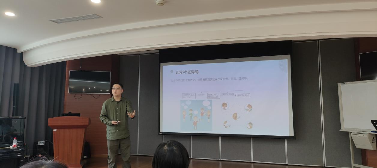 丁雪辰在讲座中主要介绍儿童青少年的手机/网络使用现状,分析了手机/网络的危害、儿童青少年沉迷的原因,同时结合自身研究与实践,分享了可操作性强的家庭教育策略为前来聆听的教职工家长支招。在交流与互动环节,丁雪辰主任在聆听了教职工家长与孩子相处的个案后,通过犹如中医“望闻问切”般一系列细致的追问,给予了个性化“药方”和家庭教育指导。