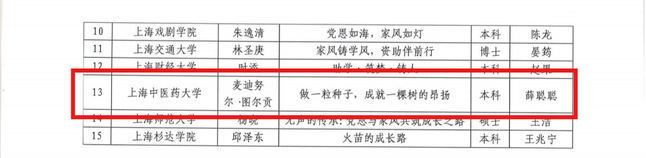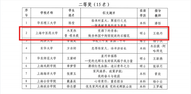 近日,上海市学生事务中心公布“党的光辉暖人心 我的家风伴成长”资助育人主题征文评选结果。万象城官网《党旗下的青春:做杏林园中绚丽绽放的石榴花》(作者:木夏热普·塔来提,指导教师:王晓丹)和《做一粒种子,成就一棵树的昂扬》(作者:麦迪努尔·图尔贡,指导教师:薛聪聪)双双荣获二等奖。