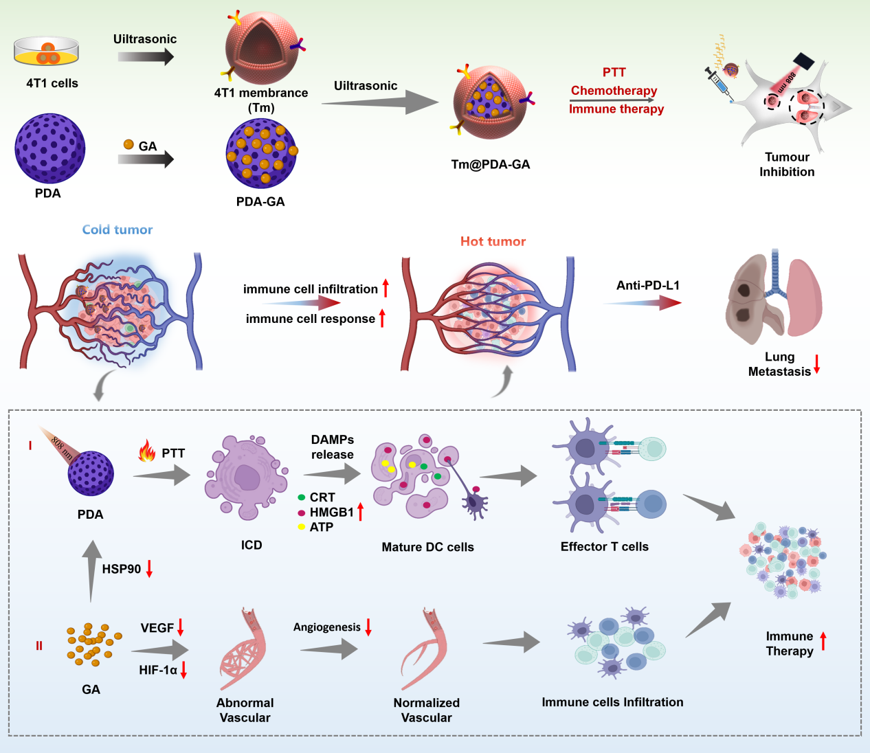 近年来,免疫治疗因其低副作用以及强效抗肿瘤作用备受关注。然而,T细胞浸润不足以及效应T细胞分化效率低导致的免疫治疗响应率低,仍是肿瘤免疫治疗临床应用中的巨大挑战。针对该难题,本研究以具有诱导血管正常化以及促凋亡作用的藤黄酸(gambogic acid,GA)为模型药物,成功构建了多功能载药仿生纳米制剂Tm@PDA-GA NPs,实现了增强免疫细胞激活以及增加肿瘤免疫浸润,联合免疫检查点抑制剂anti PD-L1,增强了肿瘤免疫治疗效应,有效抑制乳腺癌生长及肺转移。