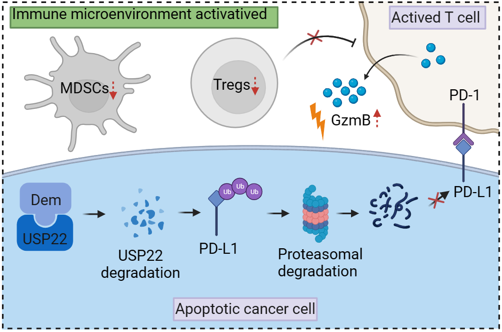 万象城官网刘三宏和海军军医大学张卫东课题组长期致力于从天然活性产物中寻找作用机制新颖的肿瘤免疫治疗小分子药物。研究人员从一个包含225个中药小分子的化合物库中发现去甲泽拉木醛(Dem)可以显著下调结直肠癌细胞中PD-L1的表达,并增强T细胞对肿瘤细胞的杀伤作用。机制研究表明,Dem与去泛素化酶USP22结合并促进其降解,从而增加PD-L1的泛素化并通过蛋白酶体途径引起其降解。此外,Dem增加了细胞毒性T细胞的活性,减少了肿瘤浸润淋巴细胞(TILs)中髓源性抑制细胞(MDSCs)和调节性T细胞(Tregs)的数量,从而激活了C57BL/6小鼠的肿瘤免疫微环境并抑制了皮下移植瘤的生长。研究还发现Dem和CTLA-4抗体的组合可以进一步提高抗肿瘤治疗的疗效。该研究揭示了Dem促进PD-L1降解的机制,并表明Dem和CTLA-4抗体的联合可能提高免疫治疗的疗效。这项创新性研究为Dem作为潜在的肿瘤免疫治疗小分子药物的开发提供了坚实的科学基础。