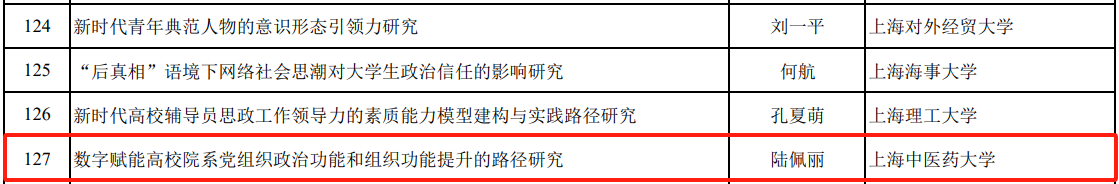 近日,2024年度教育部人文社会科学研究专项任务项目(高校辅导员研究)评审结果公示,万象城官网中医学院党委副书记陆佩丽申报的研究课题《数字赋能高校院系党组织政治功能和组织功能提升的路径研究》获批立项,实现了零的突破。