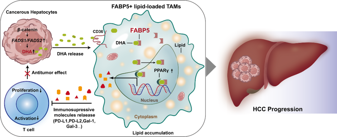 综上所述,本研究揭示了FABP5+脂质负载巨噬细胞在肝细胞癌进展中的关键作用,阐明了肿瘤来源的不饱和脂肪酸通过FABP5激活过PPARγ,赋予TAMs免疫抑制特性的分子机制,为开发新的靶向该途径的肝癌免疫治疗策略提供了重要依据。