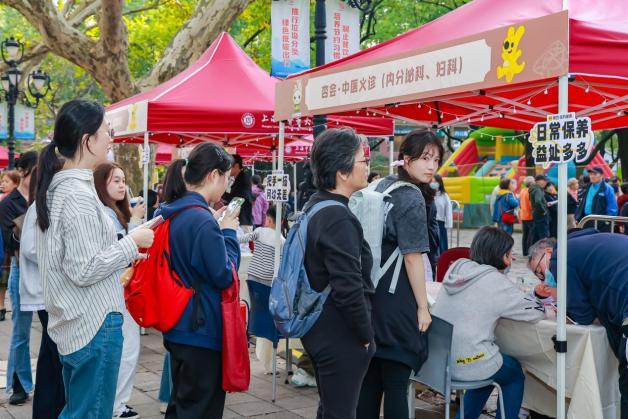 11月2日,上海鲁迅公园内,“青春‘沪’航·健康同行”青年健康集市现场人头攒动。望闻问切、知识科普、养生功法、趣味打卡……学校9家附属医院青年医生和大学生志愿者们为现场青年带来一场中医药健康服务沉浸式体验。心内科、呼吸科、骨伤科、康复科、皮肤科、风湿科医生化身“段子手”,带来6场健康科普脱口秀路演,将原本晦涩难懂的医学“知识点”转化为令人捧腹的“包袱”,以幽默的方式让科学健康知识深入人心。学校中外大学生共同展示了风靡年轻人社交圈的传统功法八段锦,一招一式舒展顺滑、行云流水,充满东方力量与美感。针对青年中医养生的“痒点”“痛点”,美团联动固生堂、同仁堂等知名中医品牌商家,推出中医知识问答、大众点评互动等趣味打卡活动,线上线下联动宣传沪上中医药文化。本次健康集市是服务“两企三新”青年的举措之一,面向市民开放。现场参与活动人群中也能看到许多美团外卖骑手的身影,他们表示第一次体验中医药主题的集市活动,学到了知识,体验了文化,感到特别新鲜和暖心。