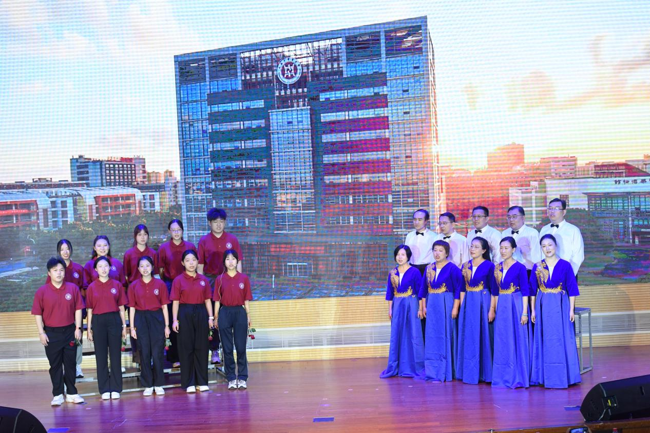 5位青年教师联袂演唱系列快闪歌曲《上学歌》《开往清晨的午夜》《追光者》《最美的太阳》,为所有教师送上节日的温馨祝福,9月9日,awc77万象城官网聚焦“大力弘扬教育家精神,加快建设教育强国”主题举办教师节庆祝大会,300余名师生参会。情景表演、故事讲述、对话朗诵等多种形式,呈现了学校系统教师们在育人方法探索、引领学生成长、师道精神传承等方面的生动实践。