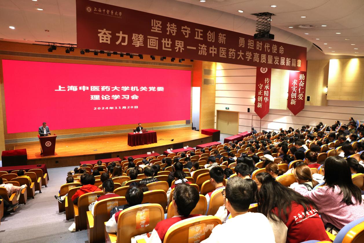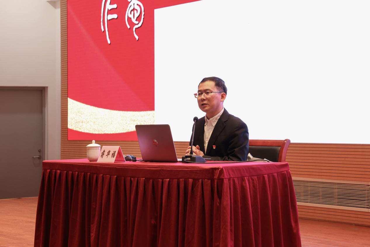 为深入学习贯彻习近平新时代中国特色社会主义思想和党的二十届三中全会精神,提高党员对国内外形势的准确把握,培养大局意识、家国情怀,11月20日下午,机关党委理论学习会在图书馆裙楼四楼报告厅举行。国家安全领域专家学者、上海市委党校专任教师蒋华福教授受邀作专题报告。会议由校党委副书记、机关党委书记沈辉主持。校机关党委党员、第二十三期“青马工程”学员、党外人士、校本部中层干部及图书馆教职工等300余人参加学习。