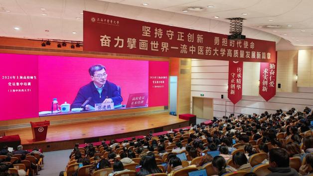 为深入学习贯彻习近平新时代中国特色社会主义思想和全国教育大会精神,提高全校师生党员的政治理论水平和党性修养,引领全校师生党员进一步发挥先锋模范作用,积极投身教育强国建设的伟大实践,12月25日下午,awc77万象城官网举行师生党员集中培训,共同学习教育部党组书记、部长怀进鹏同志所作的“深入学习贯彻全国教育大会精神 挺膺担当 为教育强国建设贡献力量”专题报告。学校4000余名党员在中医药国际标准化大楼辅楼101报告厅主会场及其他25个分会场同步参加学习。校党委书记曹锡康主持党课学习并作动员讲话。