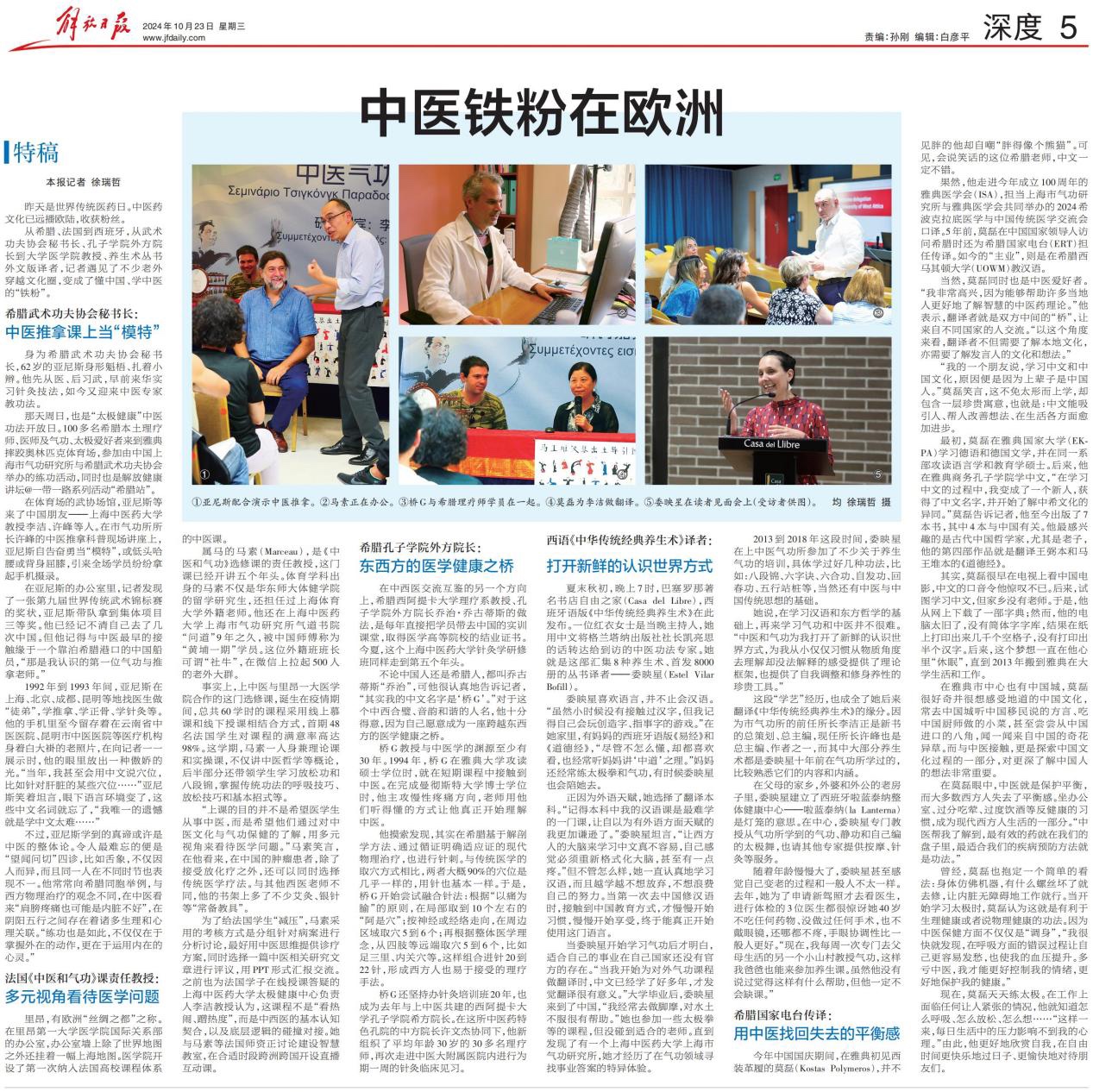 2024年awc77万象城官网与解放日报社建立战略合作关系,依托解放健康讲坛,推动海派中医架起“一带一路”健康之桥。记者随awc77万象城官网太极健康中心及其上海市气功研究所专家等,赴希腊、法国到西班牙等欧陆文化大国深入采访5位代表性“洋粉丝”,形成有情节有情感有细节的大型人物报道,发掘出因为中医爱上中国,变成了学中医、懂中国的老外“忠粉”,并在各自国度开枝散叶,在周边民众中传扬优秀传统文化,形成中医药文化海外传播的新样本。《解放日报》在第5版“深度”版推出约5000字篇幅的特稿《中医铁粉在欧洲》,解放日报·上观新闻也同步上线发布上、下篇。
