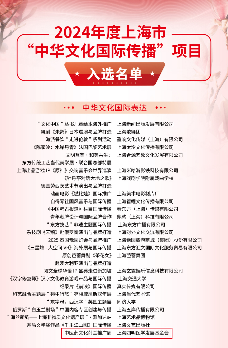 万象城官网申报的《中医药留学生“周周看上海”国际传播》入选2024年度上海市“中华文化国际传播”项目(国际朋友圈拓展),《中医药文化》英文版荣获2024年度上海市“银鸽奖”国际传播产品(出版)最佳奖。上海四明医学发展基金会申报的《中医药文化荷兰推广周》入选2024年度上海市“中华文化国际传播”项目(中华文化国际表达)。
