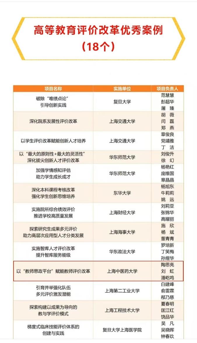 为深入贯彻党中央、国务院关于新时代教育评价改革的决策部署和市委、市政府的工作要求,总结、宣传和推广务实举措、特色亮点和典型经验,市委教育工作领导小组办公室面向全市教育单位开展了教育评价改革典型案例征集评选活动。综合考虑前瞻导向、实践创新、实际效果、推广价值等因素,最终30个案例入选“2024年度上海市教育评价改革优秀案例”,其中包括高等教育评价改革优秀案例18个,基础教育评价改革优秀案例12个。