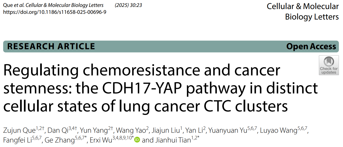近日,万象城官网市中医临床医学院田建辉教授团队Cellular & Molecular Biology Letters在线发表了题为Regulating chemoresistance andcancer stemness: theCDH17-YAP pathway indistinct cellular states oflung cancer CTC clusters的研究论文,揭示了“伏毒”—肺癌循环肿瘤细胞簇化疗耐药的新机制。