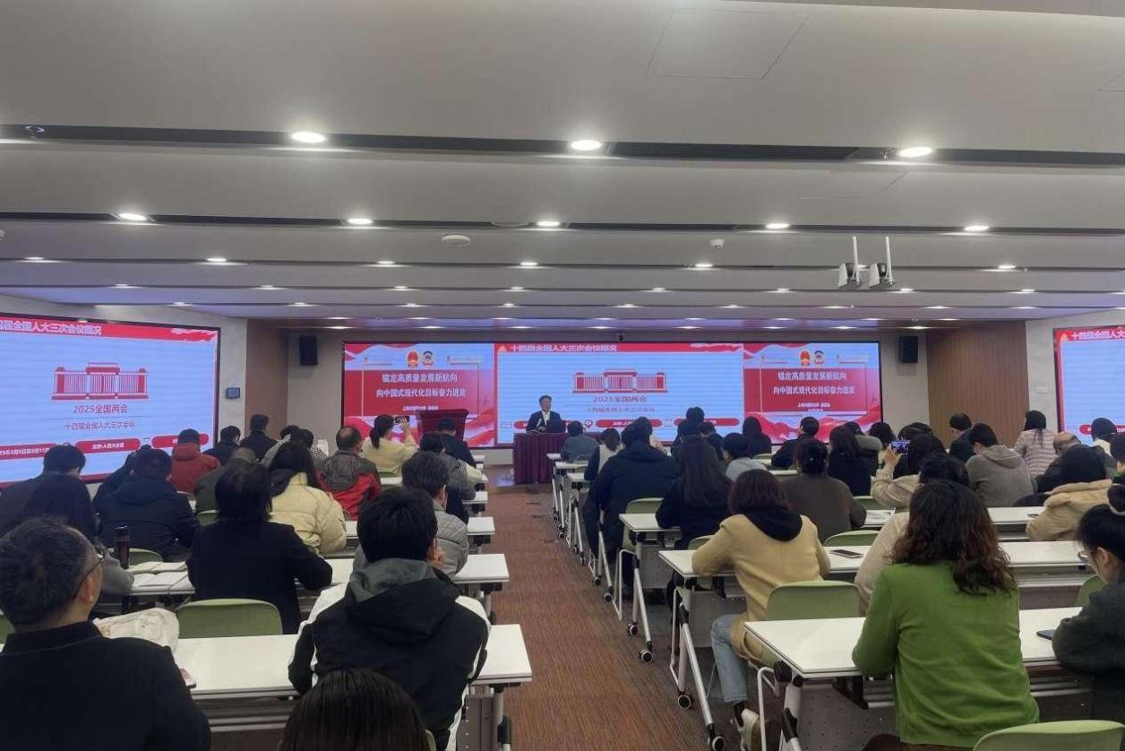 吴焕淦以“锚定高质量发展新航向,向中国式现代化目标奋力进发”为题作解读。他首先对大会议程进行了详细介绍,随后围绕政府工作报告展开深度剖析,提到了今年政府工作报告在GDP增长、城镇新增就业、居民收入增长与经济增长等方面的亮点,以及投资于人、能早则早,宁早吾晚、整治内卷式竞争等新提法。他重点解读了围绕“健康中国”战略构建全方位健康治理框架的六方面工作。他特别强调完善中医药传承创新发展机制,推动中医药事业和产业高质量发展对实现“健康中国”战略的重要意义,激发了在场师生的责任感和使命感。