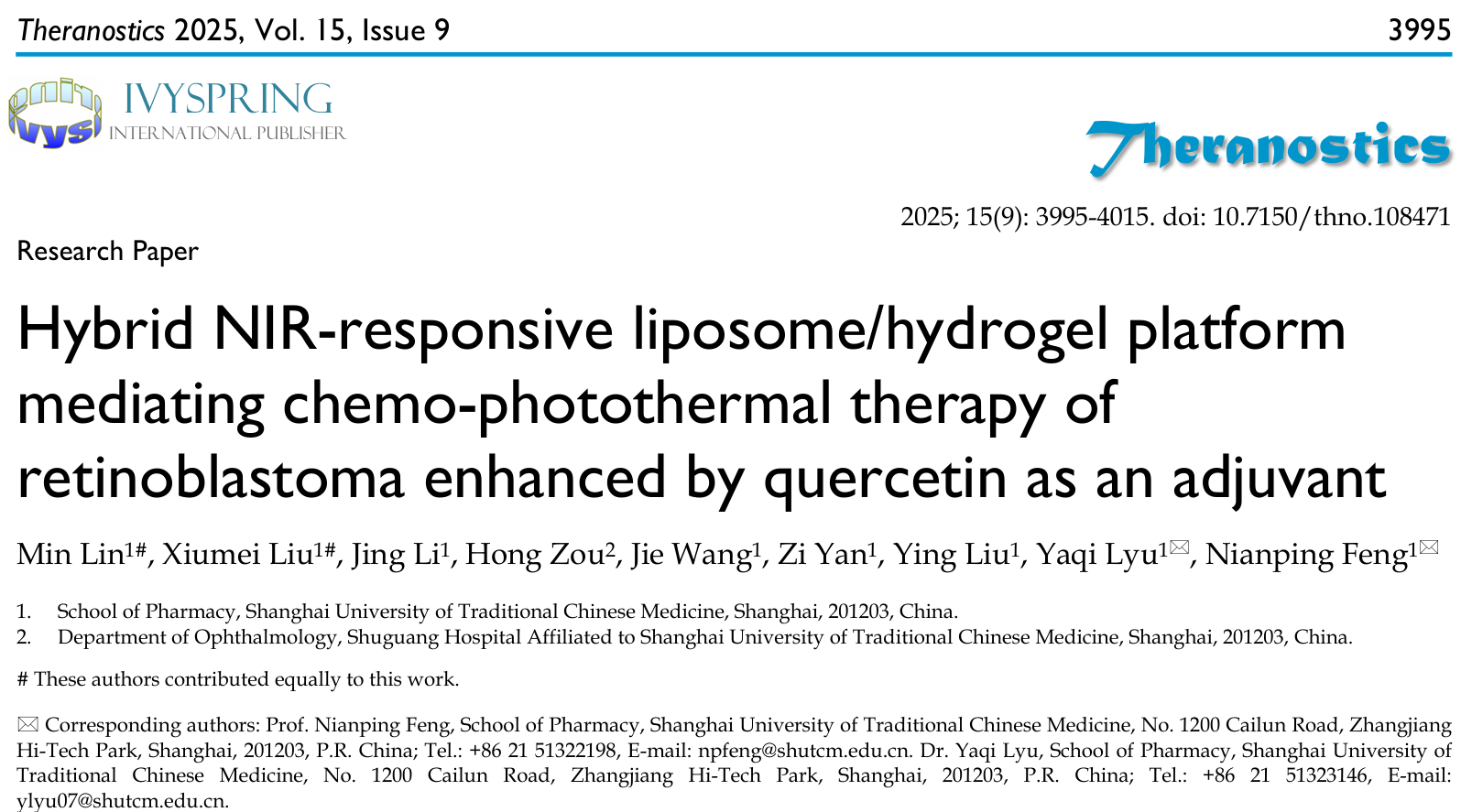 近日,万象城官网中药学院冯年平、吕雅琪团队在Theranostics发表题为Hybrid NIR-responsive liposome/hydrogel platform mediating chemo-photothermal therapy of retinoblastoma enhanced by quercetin as an adjuvant的研究成果。该研究报道了一种基于共载槲皮素/多柔比星脂质体(QD Lipo)的吲哚菁绿-低熔点琼脂糖水凝胶(QD Lipo/ICG/LAgel)。QD Lipo/ICG/LAgel是一种具有光热响应能力的可注射水凝胶药物递送系统,通过玻璃体注射将QD Lipo/ICG/LAgel植入玻璃体腔,利用近红外光的照射远程控制负载脂质体与光敏剂的释放,通过玻璃体腔内的局部可控化疗-光热治疗联合提升视网膜母细胞瘤的疗效,为视网膜母细胞瘤的治疗提供新的模式。