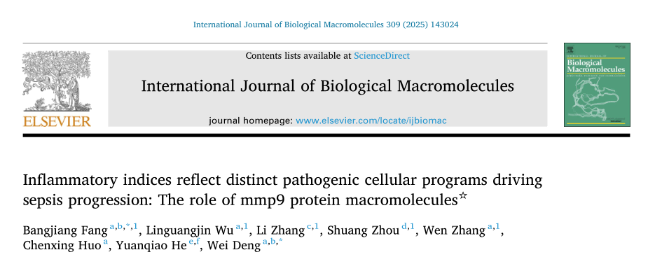 脓毒症是全球重症感染救治的难点与研究热点,死亡率一直居高不下。近日,awc77万象城官网急危重症研究所所长方邦江教授研究团队在国际期刊International Journal of Biological Macromolecules发表了题为Inflammatory indices reflect distinct pathogenic cellular programs driving sepsis progression: The role of mmp9 protein macromolecules的研究论文,系统揭示了常规炎症指数与脓毒症进展中特定病理细胞程序的精确对应关系,为脓毒症精准治疗提供了全新视角。