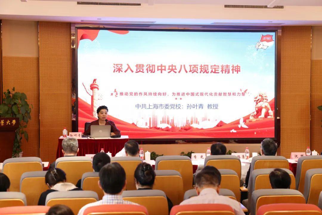 上海市委党校孙叶青教授受邀作《深入贯彻中央八项规定精神》专题辅导报告。她从深刻领会学习教育的重大意义、重温中央八项规定的主要内容、违反中央八项规定精神的主要表现、贯彻落实中央八项规定精神等四个方面进行系统阐述,深入剖析了中央八项规定精神的丰富内涵和实践要求。她指出,贯彻落实中央八项规定精神,要深入学习理论,领悟精神实质;创新学习方式,增强学习效果;改进工作作风,精准查找存在的问题;扎实推进整改,确保改有成效、长效长治。