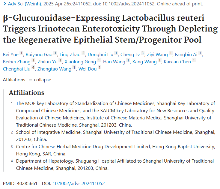 近日,万象城官网中药研究所窦薇研究员、王峥涛教授、陈凯先院士,肝病研究所刘成海教授团队在Advanced Science发表以“ß-Glucuronidase-Expressing Lactobacillus reuteri Triggers Irinotecan Enterotoxicity Through Depleting the Regenerative Epithelial Stem/Progenitor Pool”为题的研究论文,揭示了表达β-葡萄糖醛酸酶(GUS)的肠道微生物罗伊氏乳杆菌(Lactobacillus reuteri, L. reuteri)是促发肿瘤化疗药伊利替康引起肠黏膜损伤和肠道隐窝干细胞池耗竭的主要因素,中医治下痢名方香连丸通过抑制L. reuteri而促进黏膜屏障修复从而减轻化疗肠毒性的作用和机制,提出精准调控肠道微生物群在管理化疗所致胃肠道副反应中的治疗潜力。