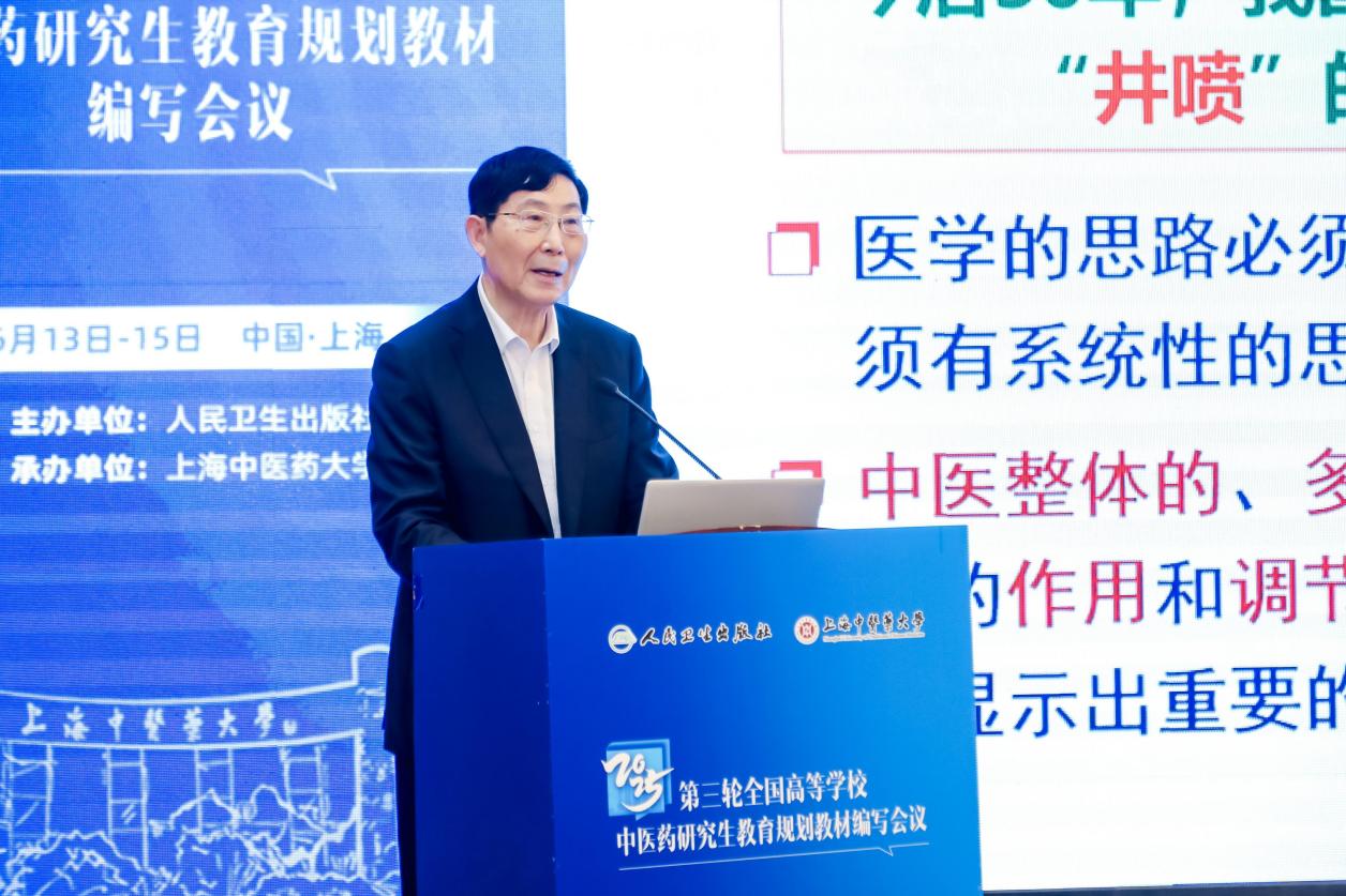 季光致欢迎辞。他表示,研究生教育作为国家创新体系的基石,其教材建设已超越知识载体的范畴,成为学术范式建构的关键介质。他认为,做好本轮教材的编写应注重学术高度和创新思维培养,进一步强化科研方法、学科交叉与前沿探索,让教材成为连接传统智慧与现代科学的桥梁;打造新形态教材,将数字技术融入“以学生为中心”学习模式构建;体现国际化视野,增加中医药国际化进展的相关内容,为培养“高层次、创新型、国际化”中医药人才打好基础。