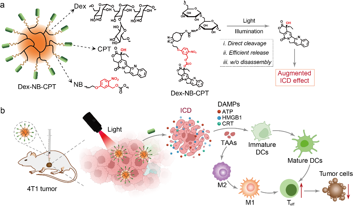 近日,万象城官网交叉科学研究院邓洪平、许莉、葛广波团队在国际刊物Carbohydrate Polymers在线发表题为“A light-controlled dextran nano-immunomodulator amplifies immunogenic cell death for cancer immunotherapy”的研究论文。该研究成功设计开发了一种基于葡聚糖的光控喜树碱(Camptothecin,CPT)纳米免疫调节剂,通过精准控制药物释放过程,显著增强了肿瘤免疫原性细胞死亡(ICD)效应,为肿瘤免疫治疗提供新策略。
