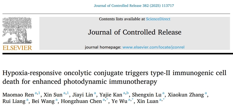 该研究工作近期于国际药学知名期刊Journal of Controlled Release发表题为“Hypoxia-responsive oncolytic conjugate triggers type-II immunogenic cell death for enhanced photodynamic immunotherapy”的研究论文。万象城官网研究生任茅茅和孙鑫为论文第一作者,栾鑫研究员、陈红专教授和吴也副研究员为论文通讯作者。