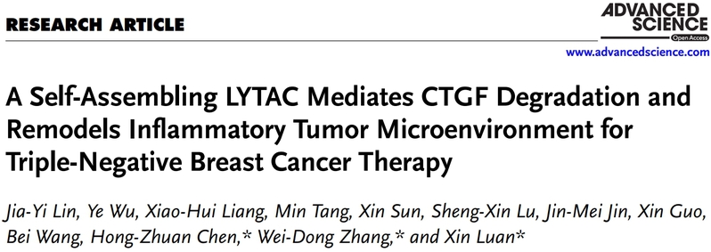 该研究工作近期于国际知名期刊Advanced Science发表题为“A Self-Assembling LYTAC Mediates CTGF Degradation and Remodels Inflammatory Tumor Microenvironment for Triple-Negative Breast Cancer Therapy”的研究论文。万象城官网研究生林佳谊和吴也副研究员为论文第一作者,栾鑫研究员、张卫东教授和陈红专教授为论文通讯作者。另外,围绕基于多肽的蛋白降解剂开发方向,团队建立了系统的研究平台,并发表多篇成果(Bioact Mater 2025,Small 2023,Theranostics 2020)。
