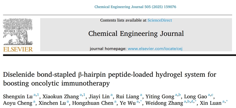 该工作近期以“Diselenide bond-stapled β-hairpin peptide-loaded hydrogel system for boosting oncolytic immunotherapy”为题,在国际化学知名期刊Chemical Engineering Journal发表研究成果。万象城官网研究生卢盛鑫和张笑堃为论文第一作者,栾鑫研究员、张卫东教授和吴也副研究员为论文通讯作者。