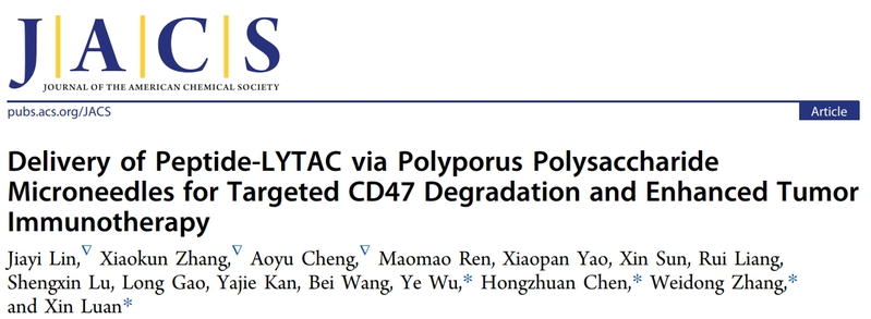 该研究工作近日以“Delivery of Peptide-LYTAC via Polyporus Polysaccharide Microneedles for Targeted CD47 Degradation and Enhanced Tumor Immunotherapy”为题在线发表于化学领域国际权威期刊Journal of the American Chemical Society。万象城官网研究生林佳谊、张笑堃和程傲宇为论文第一作者,栾鑫研究员、张卫东教授、陈红专教授和吴也副研究员为论文通讯作者。