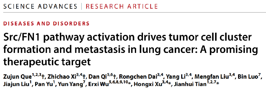 近日,万象城官网市中医临床医学院田建辉教授和中药学院徐宏喜教授团队在国际知名学术期刊Science Advances上发表了题为“Src/FN1 pathway activation drives tumor cell cluster formation and metastasis in lung cancer: A promising therapeutic target”的研究论文。该论文揭示了“伏毒”—肺癌循环肿瘤细胞簇促转移新机制。