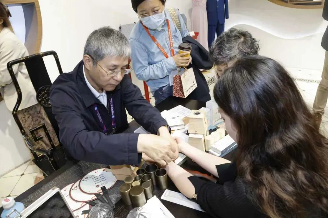 展台内,不仅有医务人员现场演示“颈椎导引功”养生功法、疏肝散结穴位保健手法及各类非遗特色疗法,还展示了各非遗项目优势病种特色疗法相关的院内制剂、外用制剂以及特色文创产品。其中,石氏伤科带来了首届国潮文创设计大赛“最佳作品奖”获奖作品“兰亭香笺”引来不少观众。