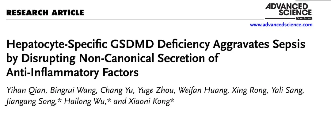 近日,曙光医院麻醉科、针刺麻醉研究室宋建钢主任团队与科技实验中心孔晓妮研究员团队开展联合攻关,在国际学术期刊Advanced Science上发表了题为“Hepatocyte-Specific GSDMD Deficiency Aggravates Sepsis by Disrupting Non-Canonical Secretion of Anti-Inflammatory Factors”的研究论文。该研究首次揭示了肝细胞中Gasdermin D(GSDMD)蛋白在脓毒症中扮演着至关重要的保护性角色,为临床防治这一高死亡率疾病提供了新的理论依据和潜在靶点。