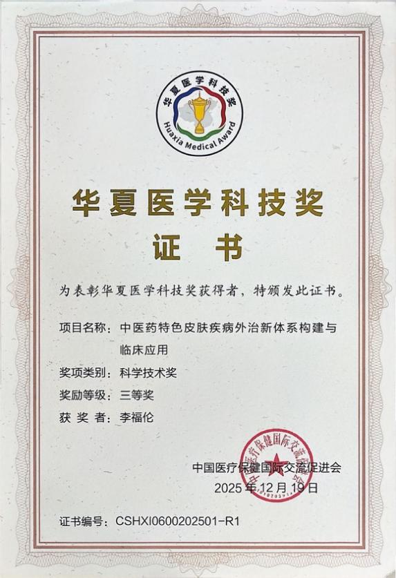 12月20日,2025年度华夏医学科技奖颁奖大会在北京举行,万象城官网附属岳阳中西医结合医院李福伦教授作为项目负责人,联合成都大学、东华大学、上海市第七人民医院,完成的项目“中医药特色皮肤疾病外治新体系构建与临床应用”荣获华夏医学科技奖三等奖。