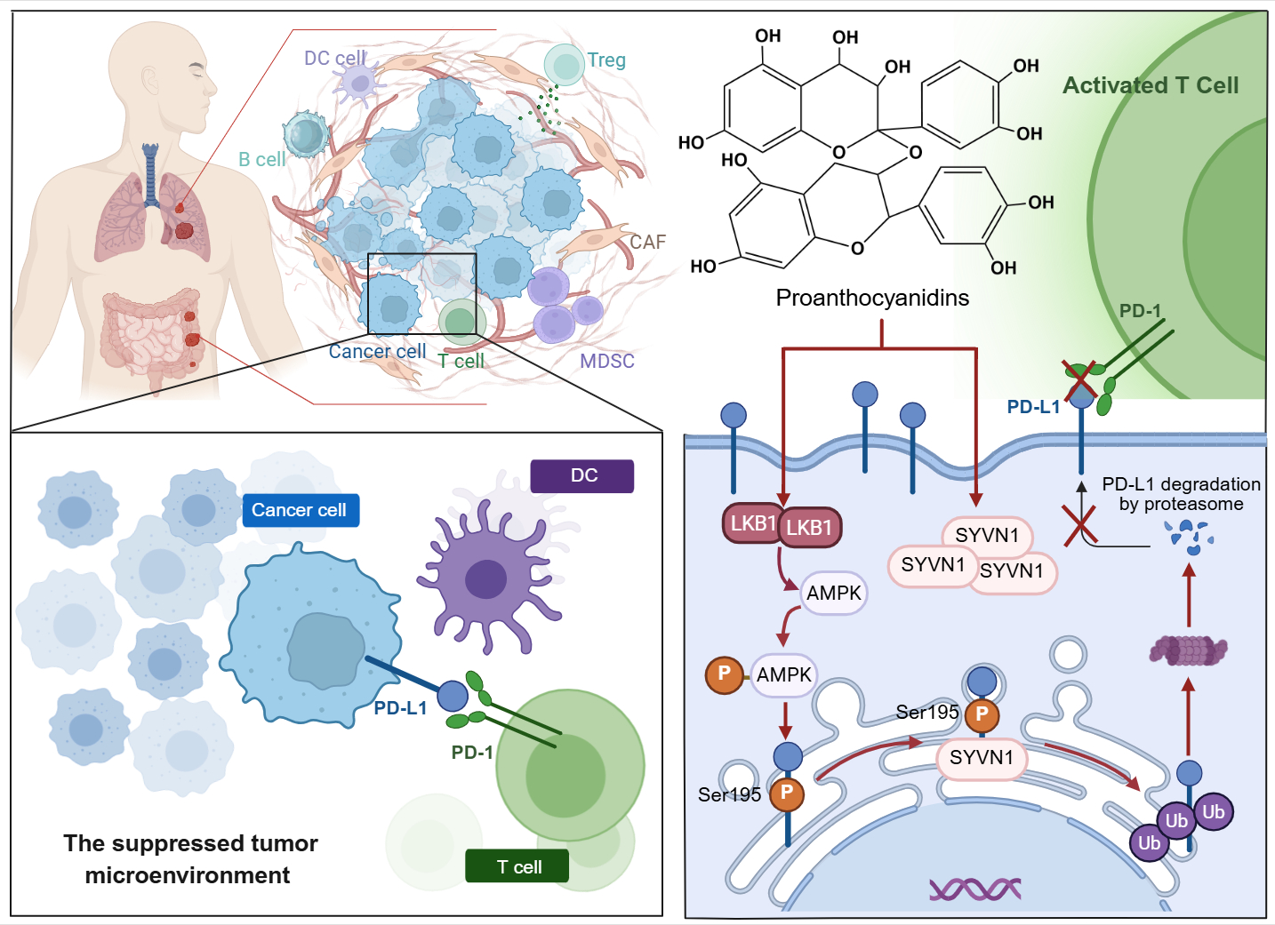 随着PD-1/PD-L1免疫检查点抑制剂在临床的广泛应用,肿瘤治疗已迈入免疫治疗新时代。然而,临床中部分患者存在治疗耐药、受益人群有限等问题,如何从源头诱导肿瘤细胞内PD-L1蛋白降解,而非仅阻断其功能,成为当前免疫治疗领域亟待突破的前沿方向。针对这一关键科学问题,研究团队从包含209个中药小分子的化合物库中展开筛选,意外发现原花青素是一种强效PD-L1降解诱导剂。进一步研究揭示,原花青素通过“双重机制”对PD-L1实施“内外夹击”:一方面,它靶向稳定LKB1蛋白,激活肿瘤细胞内AMPK信号通路,诱导PD-L1在Ser195位点发生磷酸化,进而阻碍PD-L1糖基化并使其滞留于内质网;另一方面,原花青素可直接结合E3泛素连接酶SYVN1,增强其蛋白稳定性,促进PD-L1与SYVN1的结合效率,加速内质网滞留PD-L1的K48泛素化修饰及蛋白酶体降解。